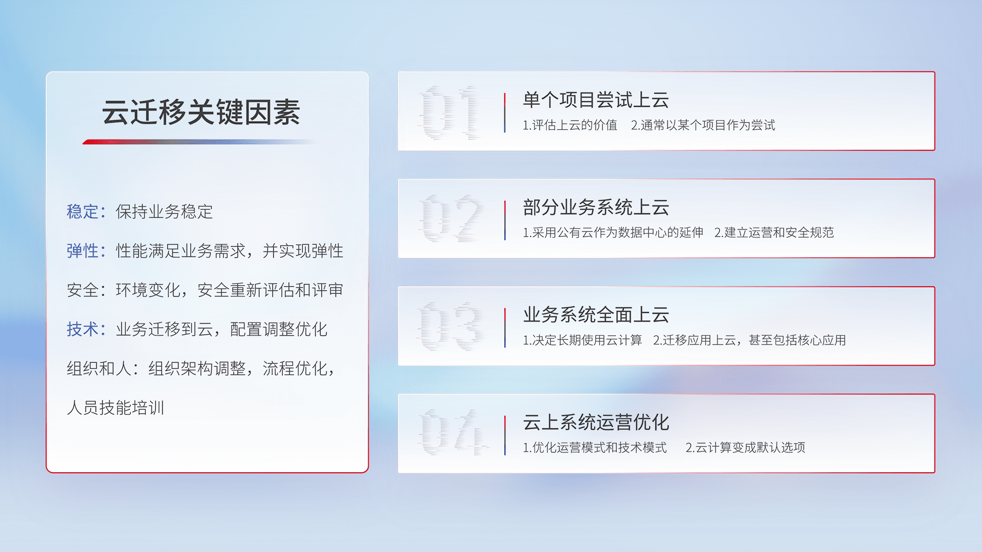 结合实际业务,,,从规划设计、、、、云平台选型、、、云原生改造、、、、数据迁移、、、、集成交付,,,迁移全过程为客户识别最佳上云路径,,,做好风险识别管理,,设计网络架构、、、身份权限、、、安全审计合规、、、操作审计、、、、日志审计、、、监控告警策略、、、、多站点容灾设计等,,对云上基础设施进行整体规划,,,,提升IT治理水平,,,以满足弹性、、、、高可用、、、、高性能的需求。。。。